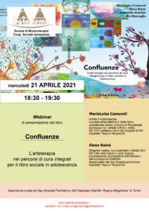 Webinar di presentazione del libro "Confluenze" L'arte terapia nei percorsi di cura integrati per il ritiro sociale in adolescenza - Prinp Editore Maria Luisa Camurati - Elena Rainò - Antonella Anichini - Pia Massaglia Il testo è rivolto ad arteterapeuti e ad operatori impegnati in attività di prevenzione e di cura con adolescenti: neuropsichiatri infantili, psicologi, educatori, insegnanti. L’esperienza qui descritta, svolta secondo un modello multidisciplinare nel Day Hospital Psichiatrico dell’Ospedale Infantile Regina Margherita di Torino, si inserisce in…